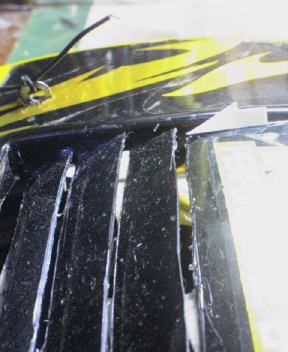 まず、ダクトを8mm間隔で写真のようにカッターなどで切り込みを入れます。そして、次に切った部分を起こす(段差にする)のですが、注意があります。起こすためには、両端に切り込みを入れるのですが、リヤからフロントへ切り込みを入れて、全部切り取らずに最後の1mmを残してください。切り取ってしまったときは接着剤などで固定してください。*最初から切り取って接着剤で固定するのもアリかもしれません(@@)ww